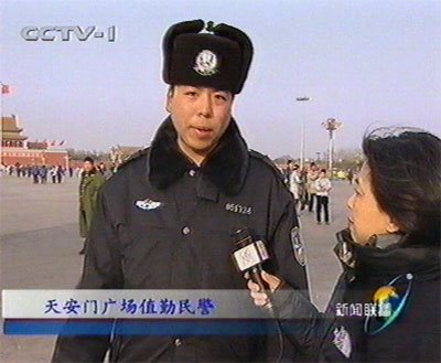 圖為當(dāng)時(shí)在天安門(mén)廣場(chǎng)執(zhí)勤的民警向記者敘述當(dāng)時(shí)的情況。(圖像取自CCTV新聞聯(lián)播)