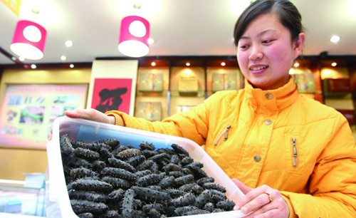 ??在寧夏路上一家海參專賣店,銷售員向記者展示本土優(yōu)質(zhì)海參。