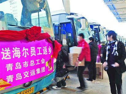 本報訊 昨晨五點半,青島汽車東站內(nèi)鞭炮聲聲,歡聲笑語。2009名海爾集團(tuán)的農(nóng)民工分乘57輛春運(yùn)包車,踏上返鄉(xiāng)的路途。據(jù)了解,這是交運(yùn)集團(tuán)今年發(fā)出的最后一批春運(yùn)包車。