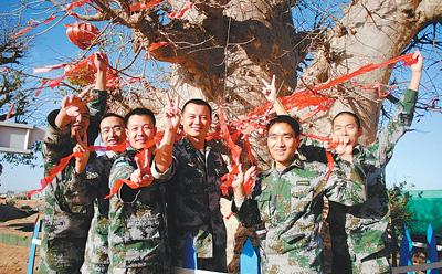 ????蘇丹達(dá)爾富爾聯(lián)合國(guó)超級(jí)營(yíng)地處于一片不毛之地,唯有中國(guó)營(yíng)區(qū)內(nèi)有兩棵參天的百年大樹(shù),官兵們分別稱(chēng)之為“常樂(lè)樹(shù)”和“常青樹(shù)”。春節(jié)來(lái)臨,中國(guó)第四批赴蘇丹達(dá)爾富爾維和大隊(duì)官兵按照慣例來(lái)到樹(shù)下,在晨風(fēng)中,系上了寄托子弟兵思念的紅綢帶(見(jiàn)上圖,本報(bào)記者吳文斌攝)。