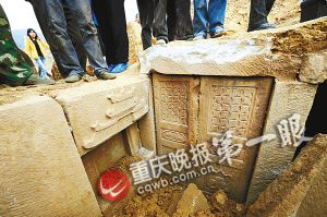 昨日,西永鎮(zhèn)文化服務中心主任祁華富介紹,此處是建成渝快速鐵路的工地。上周六對山體施工時,挖掘機刨到硬物,再刨則濺出火花———鐵齒撞擊到石質堅硬的墓室蓋。接下來,村委會接到施工方通報,鎮(zhèn)里庚即派專人晝夜值守。