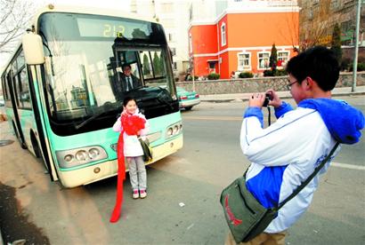 ????更令人高興的是,學生專線配備的司機都是公交集團最優(yōu)秀的駕駛員,車廂里寬敞整潔,玻璃擦得錚亮,絲綢的大紅花戴在車頭、車窗上醒目地擺著學生專車的牌子??粗妥屓烁吲d。