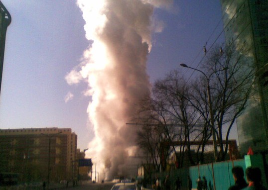 記者:好的,我現(xiàn)在就在四道口東的十字路口。其實在大概在兩公里之外,就能看到一個爆炸的現(xiàn)場。在現(xiàn)場記者看到水霧發(fā)出隆隆的響聲。據(jù)目測,大概有一個三米直徑的大圓形的爆炸漏洞在不停的往外噴水,這個水霧出來大概有幾十米遠。