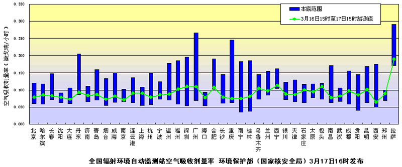 ????環(huán)境保護(hù)部(國家核安全局)有關(guān)負(fù)責(zé)人今日介紹說,環(huán)境保護(hù)部(國家核安全局)3月17日16時(shí)繼續(xù)發(fā)布全國省會(huì)城市和部分地級(jí)市輻射環(huán)境自動(dòng)監(jiān)測站實(shí)時(shí)連續(xù)空氣吸收劑量率監(jiān)測值。監(jiān)測結(jié)果匯總圖中綠色曲線代表監(jiān)測值,藍(lán)色柱體代表天然本底水平,綠色曲線均在藍(lán)色柱體范圍內(nèi)。監(jiān)測結(jié)果表明我國環(huán)境輻射水平未受到日本核電事故的影響。