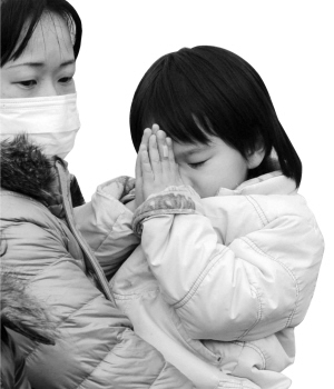 3月22日,在日本宮城縣東松島市,一名小女孩在地震和海嘯遇難者的葬禮上雙手合十。
