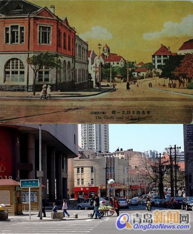 6、曲阜路口 這是一張拍攝于20世紀(jì)20年代的老照片,場景是中山路、曲阜路口。左側(cè)的建筑原是一印刷社和書店,拆除前好像是一古舊書店,1993年拆除。 照片盡頭的兩棟建筑是膠澳警察署和院內(nèi)(現(xiàn)在的公安局)的附屬建筑(至今還在),右側(cè)是一花園,當(dāng)時叫第四公園。20世紀(jì)30年代,青島市政府就是用這塊土地的出讓金在蘭山路建設(shè)了青島大禮堂。 這一帶已沒有了往日的寧靜,照片中兩個小朋友早已人老珠黃了,新照片中差不多的位置也有兩個小朋友,看來世界總是輪回的!