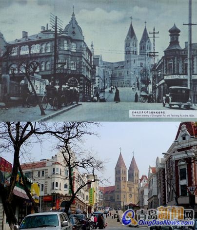![]() 曲阜路口1920年代/2009年 7、費城路口 這是一張拍攝于20世紀(jì)30年代肥城路、中山路口的老照片,左、右兩側(cè)的建筑都是建于20世紀(jì)初,左側(cè)的海恩大樓雖然還在,但已經(jīng)不是原裝的了,右側(cè)的原克羅格商業(yè)綜合樓于2004年拆除,道路盡頭的圣彌愛爾大教堂建于1931年,在它建成的50年內(nèi)一直是青島的最高建筑,也是一道靚麗的風(fēng)景線。