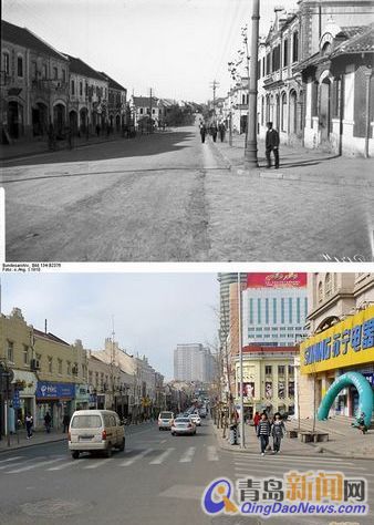 ![]() 肥城路口20世紀(jì)30年代/2009年 隨著中山路南部高樓的崛起,圣彌愛爾大教堂老大的地位已經(jīng)失去,在百盛大廈面前圣彌愛爾大教堂尤如一個小朋友一般,它在老市區(qū)的高度不知道屈居到第幾位了,但它在青島高層建筑中鼻祖的地位不可動搖。 8、 德縣路口 這是一張拍攝于1910年德縣路口的老照片,此處就是中山路的華洋分界線,中山路南北兩段的建筑風(fēng)貌差異較大,從照片中看,此時的山東街已經(jīng)形成規(guī)模,100年來,在這片熱土上誕生了眾多的老字號,就是這些老字號帶動了整個中山路的持續(xù)繁榮。直到現(xiàn)在這些老建筑基本保持了原貌,只有右側(cè)這個建筑(原代代紅商場)上世紀(jì)90年代拆除。