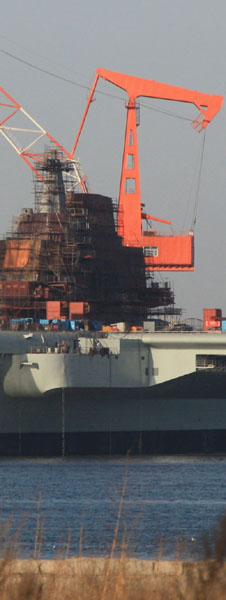 千龍網(wǎng)資料圖:改裝中的“瓦良格”號(hào)航母艦島。