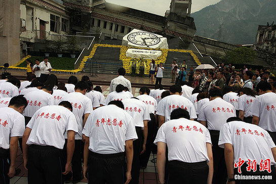 5月12日,全國(guó)各地的群眾來(lái)到四川省汶川縣映秀鎮(zhèn)地震遺址獻(xiàn)花悼念,紀(jì)念“5.12汶川大地震三周年”。據(jù)悉,群眾和失去親人的災(zāi)民通過(guò)放鞭炮,獻(xiàn)鮮花,燒紙錢等方式,祭奠長(zhǎng)眠于此的遇難者。郭國(guó)權(quán)攝 圖片來(lái)源:CNSPHOTO