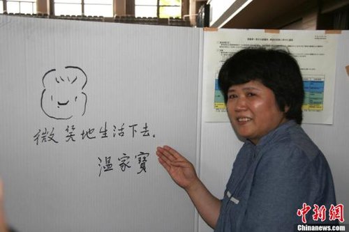5月21日,中國國家總理溫家寶訪問福島市吾妻綜合體育館避難所,慰問日本受災(zāi)民眾,并贈送慰問品。其中一位名叫谷田的日本民眾,請溫總理在自己紙門板上留言,溫總理留言:“微笑地生活下去!”。圖為谷田在留言前合影。中新社發(fā)孫冉 攝