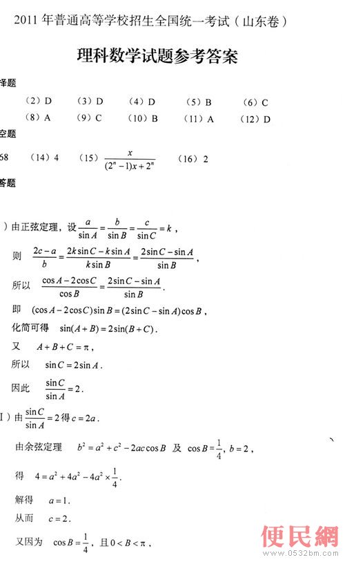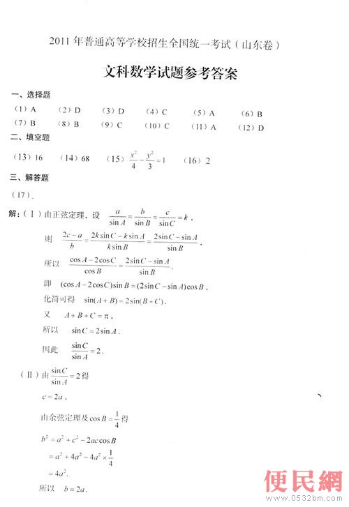 2011年普通高等學(xué)校招生全國統(tǒng)一考試(山東卷)文科綜合試題參考答案