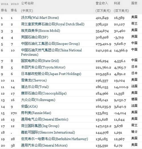中新網(wǎng)7月7日電 北京時(shí)間7月7日晚,2011年《財(cái)富》世界500強(qiáng)排行榜正式發(fā)布。美國(guó)零售業(yè)巨頭沃爾瑪再次登上榜首,中石化排在第五,是國(guó)內(nèi)企業(yè)排名最高的。中國(guó)大陸共有61家公司進(jìn)入榜單,比上一年增加了15家。如果計(jì)入臺(tái)灣地區(qū)的上榜企業(yè),中國(guó)的上榜公司數(shù)量達(dá)到69家,超過日本,僅次于美國(guó)(133家),創(chuàng)造歷史紀(jì)錄。