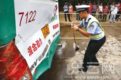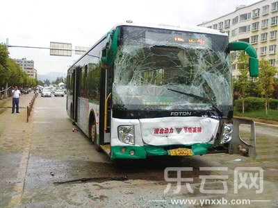 7月30日中午,一輛大貨車在石安高速公路昆電加油站對面調(diào)頭時,與一輛從安寧開往昆明的17路公交車相撞,事故中兩車均受損,公交車上11名乘客受傷。