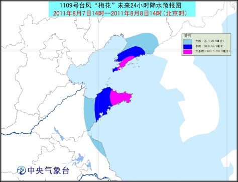 受“梅花”影響,8月7日14時至8日14時,渤海東部、渤海海峽、黃海、山東半島及其沿海、遼寧沿海、江蘇沿海、東海北部將有7~9級大風,黃海部分海域、山東東部沿海風力可達10~11級,“梅花”中心經(jīng)過的附近海面的風力有12~13級,陣風可達14~15級,浙江東北部及沿海、上海、杭州灣、長江口將有6~8級大風;江蘇東部、山東半島和遼寧南部等地有大到暴雨,局部地區(qū)有大暴雨。