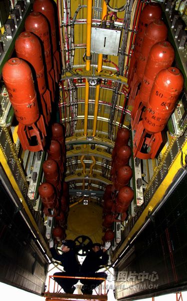 資料圖:海軍航空兵地勤人員正檢查轟-6彈艙。