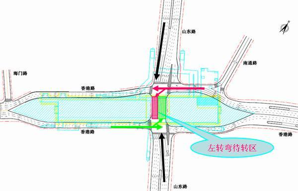 市南交警大隊李洪亮介紹說,地鐵五四廣場段施工期間,香港中路山東路路口在地鐵施工期間東西雙向六車道,南北雙向七車道,其中南向北4條車道,北向南3條車道。為充分利用有限的道路資源,降低施工對原有交通流的破壞,把位于路口的中心區(qū)域,設置為“東西方向”向“南北方向”左轉(zhuǎn)的待轉(zhuǎn)區(qū);并將科學調(diào)研論證,配置合理的