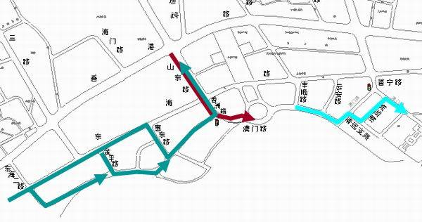 東海路山東路路口禁止自北向東左轉(zhuǎn)、禁止自西向北左轉(zhuǎn) 東海路山東路路口,禁止自北向東的左轉(zhuǎn),原自北向東左轉(zhuǎn)的車輛直行通過(guò)路口后經(jīng)香洲路左轉(zhuǎn)進(jìn)入澳門路實(shí)現(xiàn)左轉(zhuǎn)。 東海路山東路路口禁止自西向北的左轉(zhuǎn)原自西向北左轉(zhuǎn)的車輛經(jīng)東海路—惠東路(或金平路)—澳門路—香洲路—山東路實(shí)現(xiàn)左轉(zhuǎn)。 另外,為緩解澳門路普寧路口的交通壓力,澳門路向東行駛的車輛請(qǐng) |
