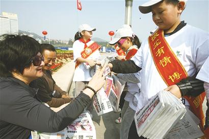 早報(bào)義工團(tuán)的小朋友們?cè)谧x者節(jié)活動(dòng)現(xiàn)場(chǎng)義賣早報(bào)