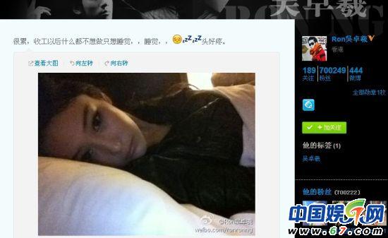 張馨予疑用了吳卓羲微博帳號自己上載床照,相中的她身穿疑似黑皮衣、沒有卸妝,似乎剛剛收工,連衣服都不換便躺在床上自拍,只是吳卓羲沒有被拍進鏡頭,她留言:“很累,收工以后什么都不想做只想睡覺,睡覺,頭好疼?!睆堒坝璨挥米约何⒉┒蒙蠀亲眶说奈⒉黠@是宣示主權(quán)。這條微博是吳卓羲的第444條微博,有網(wǎng)民高呼“好邪”﹗而該條微博瘋傳約四小時后,在凌晨四點左右便被刪掉。