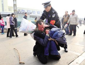 1月8日,山西太原火車站,一位沒有身份證的老農(nóng)滯留車站廣場,一民警幫他辦理臨時身份證、購票,老農(nóng)才順利上車。圖為老農(nóng)跪謝民警,民警幫老人扛好行李。