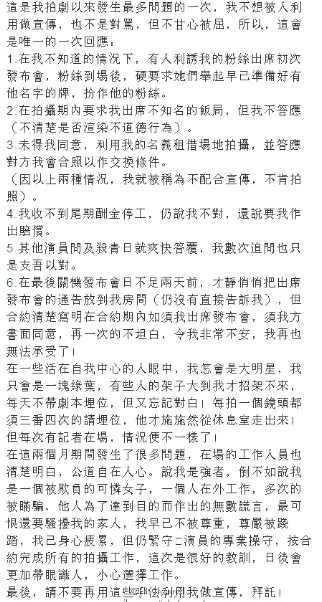 在這兩個月期間發(fā)生了很多問題,在場的工作人員也清楚明白,公道自在人心。說我是強(qiáng)者,倒不如說我是一個被欺負(fù)的可憐女子,一個人在外工作,多次的被瞞騙、他人為了達(dá)到目的而作出的無數(shù)謊言,最可恨還要騷擾我的家人,我早已不被尊重,尊嚴(yán)被踐踏,我已身心疲累,但仍緊守演員的專業(yè)操守,按合約完成所有的拍攝工作,這次是很好的教訓(xùn),日后會更加帶眼識人,小心選擇工作。