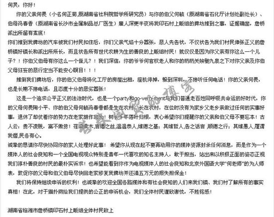 何炅父親強拆老家牌坊 村民寫聯(lián)名信泄憤(圖)
