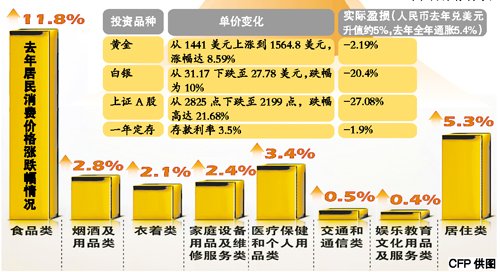 去年CPI同比增5.4% 超過4%的預(yù)期目標(biāo) CPI 2011年12月CPI同比增4.1% 創(chuàng)15個月新低;全年食品價格上漲11.8%,是拉動CPI 上行的主要因素。 專家預(yù)測,展望2012年,總體來看物價漲幅將比2011年有所回落。受通脹走向降溫,今年貨幣政策和財政政策都將持續(xù)放松和更為積極。 國家統(tǒng)計局昨日發(fā)布報告,從2011年全年的情況看,我國CPI比2010年上漲5.4%,高于年初設(shè)定的4%目標(biāo)。2011年12月份全國居民消費價格總水平(CPI)同比上漲4.1%,為2010年9月以來最低水平,且為去年7月觸及6.5%的三年高點后連續(xù)第五個月回落。 專家預(yù)測,受通脹走向降溫,今年貨幣政策和財政政策都將持續(xù)放松和積極的影響,股市滬綜指昨天微幅收跌,預(yù)計春節(jié)前大盤將維持震蕩盤升走勢。 分析: 去年通脹兩頭低中間高 高盛高華中國宏觀經(jīng)濟學(xué)家宋宇昨天對本報記者表示:去年11月份之前的幾個月總體需求增速低于趨勢水平是CPI和PPI通脹率持續(xù)回落的主要原因。 中郵證券宏觀分析師邱云波表示,2011 年食品價格上漲11.8%,是拉動CPI 上行的主要因素。非食品中煙酒、醫(yī)療保健和居住類價格漲幅也較大(見圖表)。2011年CPI 走勢呈現(xiàn)兩頭低、中間高的態(tài)勢,自7 月份觸及6.5%的高點后,緊縮政策使CPI 不斷下行。預(yù)計今年通脹壓力將有所緩解,全年CPI 將回落至3.5%左右;2011 年P(guān)PI上漲了6%。 走勢: 節(jié)日因素本月CPI將反彈 種種跡象顯示,1月中國的CPI增幅將再度攀升。據(jù)國家統(tǒng)計局分析,去年12月份,居民消費價格總水平同比漲幅中的翹尾因素消失,新漲價因素為4.1個百分點。進(jìn)入1 月份,農(nóng)業(yè)部的農(nóng)產(chǎn)品批發(fā)價格指數(shù)也繼續(xù)走高,而商務(wù)部公布的食品價格擬合環(huán)比也創(chuàng)出了近半年以來的最高周環(huán)比漲幅,總體來看,1 月份食品價格將面臨較大的上漲壓力。 國務(wù)院研究中心金融研究所副所長巴曙松昨天也在公開場合表示,2012年1月CPI增幅很可能會出現(xiàn)反彈。國海證券分析師范小陽表示:1 月份由于季節(jié)性因素和春節(jié)因素的影響,CPI 有反彈的可能,初步預(yù)計在4.2%附近。從歷史上看,1 月的環(huán)比漲幅均明顯高于12 月。但這種由于季節(jié)性和節(jié)日因素影響帶來的CPI 反彈已經(jīng)在市場的預(yù)料之中,而且從明年上半年的走勢來看,CPI 回落的趨勢并沒有改變。因此,1 月CPI的擾動不會對市場造成太大的影響。 盡管年末食品價格有所抬頭,但中國12月CPI增速仍連續(xù)第五個月回落,并創(chuàng)下15個月新低。通脹如預(yù)期下滑,為政策放寬預(yù)留更多空間。分析師普遍預(yù)計,接下來政策面還是以微調(diào)為主,存款準(zhǔn)備金率下調(diào)只是時間問題,最早可能在農(nóng)歷春節(jié)前。 預(yù)測: 政策放寬有更多空間 摩根大通首席中國經(jīng)濟學(xué)家朱海斌昨天對本報記者表示:通脹壓力緩解的正面消息為決策者將政策重點轉(zhuǎn)移至關(guān)注增長提供更多空間。預(yù)計春節(jié)前夕,央行會將存款準(zhǔn)備金率下調(diào)50個基點,很可能在本周內(nèi)下調(diào),以緩和季節(jié)性因素(中國新年前夕的現(xiàn)金需求以及1月增加的財政存款)帶來的流動性壓力。未來,貨幣政策將偏向適度寬松。 瑞穗證劵亞洲公司董事總經(jīng)理沈建光表示,今年貨幣政策料將持續(xù)放松,財政政策將更積極,今年是投資A股的好機會。記者陳海玲 專家預(yù)測 物價漲幅將進(jìn)一步回落 “4.1%的漲幅在預(yù)料之中,物價回落態(tài)勢進(jìn)一步確立?!敝袊缈圃航?jīng)濟研究所宏觀經(jīng)濟室主任張曉晶分析判斷,物價走勢難以背離中國經(jīng)濟增速回落帶來總需求回落的大勢。專家們普遍認(rèn)為,隨著中國經(jīng)濟增速回落態(tài)勢的確立,物價從總體態(tài)勢看,漲幅將進(jìn)一步回落。但當(dāng)前價格調(diào)控仍不能掉以輕心,未來價格走勢也存在一定的不確定性。 2011年全年,我國CPI比上年上漲了5.4%,超出年初4%左右的調(diào)控預(yù)期目標(biāo)。中國國際經(jīng)濟交流中心咨詢研究部副部長王軍認(rèn)為,這說明當(dāng)前我國面臨較為長期的溫和通脹的壓力,勞動力價格、資源價格等成本推動壓力將在較長時期內(nèi)存在,價格調(diào)控要做好長期作戰(zhàn)的準(zhǔn)備。 輸入性通脹因素還存在較大的不確定性。王軍分析,雖然世界經(jīng)濟不景氣總體上降低了對大宗商品的需求,美元走強也有利于壓低大宗商品價格,但伊朗等地緣政治的不確定因素,使得石油價格仍然存在猛漲的可能性,中國面臨的輸入性通脹壓力充滿不確定性。 “展望2012年,總體來看物價漲幅將比2011年有所回落。不過成本推動的價格上漲壓力將長期存在,穩(wěn)定物價依然是一項重要任務(wù)?!北本┐髮W(xué)國民經(jīng)濟核算中心研究員蔡志洲說。(新華) 網(wǎng)友算賬 炒股不如賣舊報的收益 昨天,國家統(tǒng)計局公布的數(shù)據(jù)顯示,2011年CPI總水平比上年上漲5.4%。這不僅僅高于年初設(shè)定的4%目標(biāo),而且吞噬了幾乎所有投資人的賺錢夢想。 2011年,如果你將手里的一萬元投資白銀,去除通脹因素、匯率因素后,虧損額是2040元;如果買了黃金,賬面上虧損額219元;如果投資中國上證A股,最后手里只剩下7292元;而這些都還沒計算交易成本。