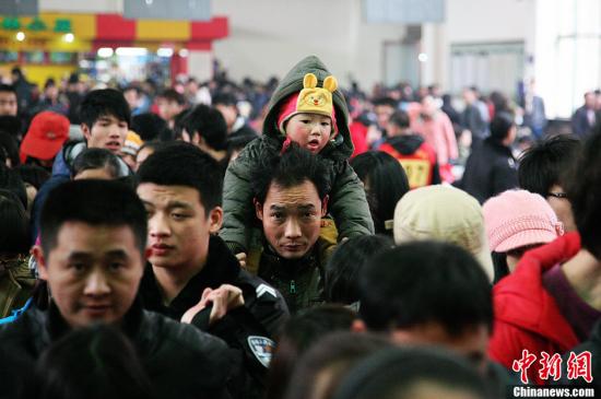 2012年春運(yùn)從1月8日拉開(kāi)帷幕,2月16日結(jié)束,持續(xù)40天。由于2012年春節(jié)較2011年春節(jié)提前11天,春節(jié)期間,學(xué)生流與農(nóng)民工、商務(wù)、探親流相互交織,客流將迅猛增長(zhǎng)。圖為父親讓孩子騎在自己的肩上。楊華峰攝