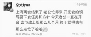 網(wǎng)友根據(jù)“朵太lynn”的微博,扒出了讓人無比羨慕的“幸福生活”。1月16日,“朵太lynn”寫道:“上海兩會結(jié)束了,開完會的領(lǐng)導(dǎo)要下發(fā)任務(wù)和方針,今天老公一直在開會,去市政上班那么幾個月,終于覺得他有那么點(diǎn)忙了……”另外,進(jìn)口美食、浪漫出游,還有年底近萬元的購物小票等,通通都是“朵太lynn”的微博內(nèi)容。
