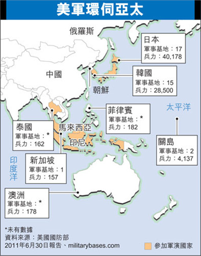 美軍環(huán)伺亞太 中新網(wǎng)2月7日電 據(jù)香港《文匯報(bào)》報(bào)道,由美國(guó)及泰國(guó)主導(dǎo)的第31次“金色眼鏡蛇”軍事演習(xí)7日將在泰國(guó)展開(kāi),持續(xù)至本月17日。除了美泰兩國(guó),參加的還有新加坡、日本、韓國(guó)、印度尼西亞及馬來(lái)西亞,總?cè)藬?shù)達(dá)1.3萬(wàn),是亞太地區(qū)迄今最大規(guī)模的多國(guó)軍演。分析認(rèn)為,隨著美軍積極部署重返亞太,美軍在西太平洋大舉增兵,并接連舉行聯(lián)合軍演,目的是威懾中國(guó)。 軍演中另有多國(guó)受邀參與策劃,包括澳大利亞、法國(guó)、加拿大及英國(guó)等10國(guó),而俄羅斯、中國(guó)、新西蘭、荷蘭等9國(guó)則以觀察國(guó)身份參加。據(jù)泰軍消息透露,緬甸也曾謀求參與,卻遭到美國(guó)國(guó)會(huì)拒絕,只能以觀察國(guó)身份派出數(shù)名軍官觀摩演習(xí)。 據(jù)泰方介紹,軍演內(nèi)容涵蓋反恐、人道主義救援、指揮演習(xí)、包括實(shí)彈訓(xùn)練和非作戰(zhàn)疏散演習(xí)的野戰(zhàn)演習(xí),以及維和任務(wù)演練等。美國(guó)海軍將出動(dòng)船塢登陸艦“日耳曼城”號(hào)及“托爾圖加”號(hào)、CH-46海武士直升機(jī)等多種軍機(jī)、通用登陸艇,以及M-777牽引榴彈炮。 從2010年起派兵參加“金色眼鏡蛇”的韓國(guó),今年派出登陸突擊裝甲車(chē)(KAAV)及2,600噸級(jí)登陸艦“香爐峰”號(hào),以及320名海軍和陸戰(zhàn)隊(duì)官兵參與;日本則派出約70人參加。 美軍過(guò)去一年在亞太連環(huán)舉行聯(lián)合軍演,覆蓋整個(gè)西太平洋地區(qū)之余,演習(xí)時(shí)間近乎貫穿全年。這勢(shì)必影響地區(qū)安全和區(qū)域合作,直接結(jié)果是令區(qū)內(nèi)成為新的海軍軍備競(jìng)賽場(chǎng),令不少?lài)?guó)家擔(dān)憂(yōu)。美軍又不斷增加及調(diào)整亞太軍事布局,目前已在跟新加坡、印度尼西亞、馬來(lái)西亞等國(guó)談判,試圖在這些國(guó)家設(shè)立無(wú)人偵察機(jī)基地,并已制訂計(jì)劃,把約1.5萬(wàn)士兵由沖繩調(diào)到澳洲及亞洲。 美國(guó)防部上月曾聲稱(chēng),新軍事戰(zhàn)略并非企圖遏制中國(guó),但美國(guó)總統(tǒng)奧巴馬早前公布的新軍事戰(zhàn)略報(bào)告卻與這種說(shuō)法稍有出入。今年美海軍作戰(zhàn)部宣布,將把海軍1/3戰(zhàn)艦轉(zhuǎn)移至西太平洋,意味著日后西太平洋靠近中國(guó)一側(cè)的美軍戰(zhàn)艦數(shù)目將近100艘,相當(dāng)于海軍半數(shù)兵力。 資料:美軍2011年頻繁染指亞太 東南亞 “金色眼鏡蛇2011”多國(guó)軍演(1月7日至2月18日) 地點(diǎn):泰國(guó) “肩并肩”美菲軍演(4月6日至15日) 地點(diǎn):菲律賓 美菲海上聯(lián)合戰(zhàn)備訓(xùn)練演習(xí)(6月28日) 地點(diǎn):菲律賓 南亞 “和平”海上多國(guó)軍演(3月8日至12日) 地點(diǎn):巴基斯坦附近海域 東亞 “關(guān)鍵決心”美韓軍演(3月8日至18日) 地點(diǎn):韓國(guó) “乙支自由衛(wèi)士”美韓軍演(8月16日至26日) 地點(diǎn):韓國(guó) “可汗探索”多國(guó)軍演(7月31日至8月12日) 地點(diǎn):蒙古 中亞 “草原之鷹”聯(lián)合軍演(8月8日,為期3周) 地點(diǎn):哈薩克斯坦 |
