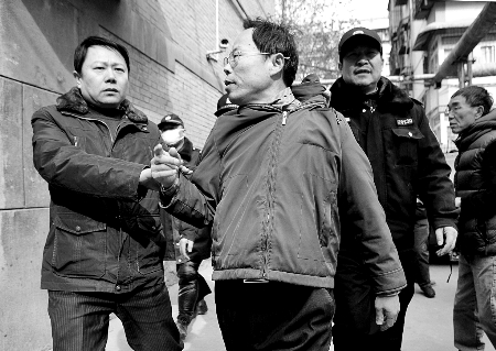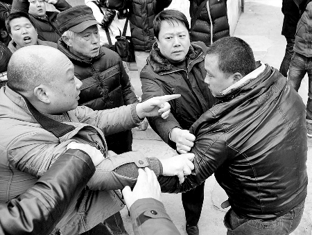 事發(fā)現(xiàn)場(chǎng),張妙丈夫王輝(右)與藥慶衛(wèi)代理律師馬延明(左)不時(shí)互有推搡?!度囟际袌?bào)》供圖
