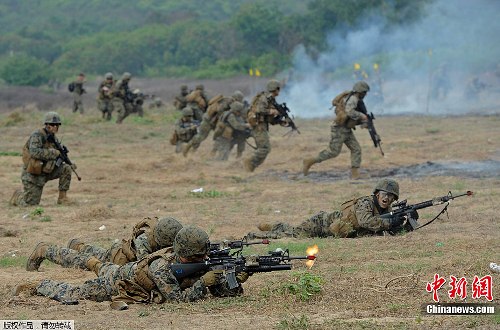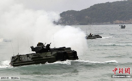 圖為從兩棲突擊車沖出的美海軍陸戰(zhàn)隊士兵建立防線。 ????據(jù)新加坡《聯(lián)合早報》11日報道,泰國、美國、新加坡、日本、韓國、印度尼西亞和馬來西亞共七國的武裝部隊,目前正在泰國春武里府的梭桃邑海軍基地進行一年一度的“金色眼鏡蛇”聯(lián)合軍演。 ????10日,七國武裝部隊在海邊進行搶灘演習,士兵們在美國海軍陸戰(zhàn)隊的兩棲突擊車(后方)的配合下,快速地登陸搶灘。 ????據(jù)介紹,“金色眼鏡蛇”軍演是以美國為首的年度跨國軍事演習,也是南亞地區(qū)最大規(guī)模的聯(lián)合軍事演習,自1982年以來每年舉行一次。 ????據(jù)悉,今年的演習共有超過1.3萬名官兵參與,從7日開始至17日,共持續(xù)10天。 |