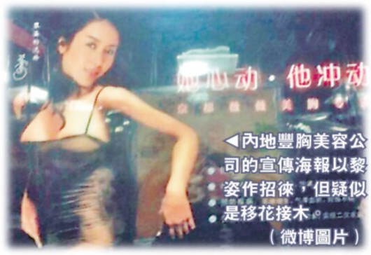豐胸美容公司的宣傳海報(bào)以黎姿作招徠,但疑似是移花接木。 據(jù)香港媒體報(bào)道,40歲的黎姿于2008年宣布退出娛樂圈后,下嫁商人馬廷強(qiáng),生了一對(duì)雙胞胎女兒,以及專心打理弟弟的美容生意。雖然她已退出娛樂圈3年多了,但她的一舉一動(dòng)仍極受關(guān)注。近日發(fā)現(xiàn)有內(nèi)地美容公司聲稱她是代言人,還在豐胸宣傳海報(bào)上把黎姿的相套在性感低胸女郎身上作招徠。黎姿立刻在微博澄清,她從來沒有為該間公司做代言人,還怒斥離譜,以正視聽。 昨天(2月11日)下午有內(nèi)地粉絲在微博上載一張豐胸美容公司的宣傳海報(bào),相片中的性感女郎穿著黑色低胸吊帶裙,上圍極為豐滿,而樣貌就跟黎姿一模一樣。不過,女郎的身材與黎姿樣貌配合得非常不自然的,就像移花接木。翻查該美容公司的官方網(wǎng)頁,網(wǎng)頁內(nèi)也聲稱黎姿是代言人。 不止一次被利用宣傳 黎姿看見粉絲上載的照片后,她立刻留言澄清。她說:“從來沒拍過這照片,移花接木,太離譜了,這公司不是我代言的。”原來黎姿早已知道該公司不止一次利用她來宣傳,她說:“這公司已經(jīng)接二連三做出這事情了,TVB從沒幫我簽有關(guān)豐胸廣告呀?!?/p> 粉絲建議控侵肖像權(quán) 不少粉絲留言表示,曾誤信黎姿真的是該公司代言人,因在內(nèi)地很多地方都見到她在該公司的宣傳海報(bào),建議她應(yīng)采取法律行動(dòng),控告該公司侵犯其肖像權(quán)。 |
