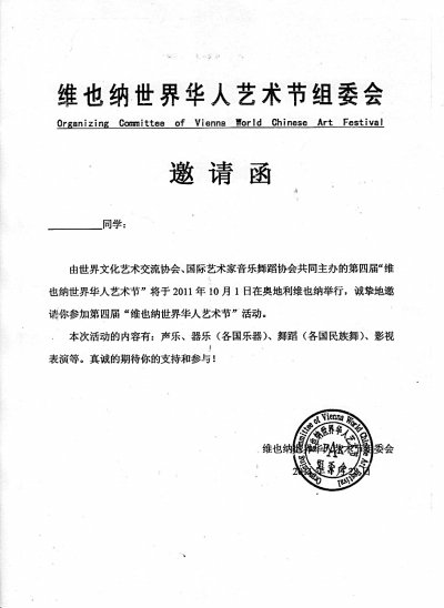 可八月份到了,莊老師方面稱簽證沒辦下來。結果耽誤了比賽,家長要求退錢時,莊老師就又遞給家長另一份邀請函和通知。上面都反映:經(jīng)過維也納國際青少年音樂節(jié)組委會與維也納世界華人藝術節(jié)組委會研究決定,因為簽證延誤導致江蘇等地區(qū)選手未能參加國際青少年藝術節(jié)的,可參加10月1日在維也納金色大廳舉行的“第四屆世界華人藝術節(jié)”活動。如果不去的話要扣除機票和違約金等費用。雖然有些氣憤,但也很無奈,劉女士最終還是帶著孩子出國參加了這一活動。