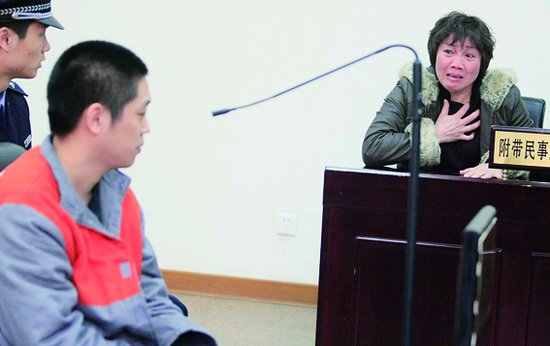 死者張某的母親在法庭上痛斥被告人趙某 攝/記者曹博遠 ????22歲男子伙同兩人來到18歲女網(wǎng)友家中將其掐死受害者 母親法庭痛斥——你們太殘忍了還我女兒 ????為了要錢,22歲的趙某伙同梁某、付某來到女網(wǎng)友張某家中,將18歲的張某掐死。 ????今日上午,被控搶劫罪的趙某等3人在二中院受審,死者張某的母親要求趙某償命。 ????上午11時,趙某等3人被帶上法庭時神情輕松,見到坐在旁聽席上的家人,3人還笑著點頭示意。 可趙某還未走到被告人席上,死者張某的母親李女士突然站起身來,揮拳就打,邊打邊哭著喊:“你們太殘忍了,還我女兒,你們這些畜生!”但很快被法警制止。 “剛才不是說了要你們控制一下嗎,要不怎么開庭?!狈ü賱裾f李女士?!耙豢吹剿麄儯揖涂刂撇蛔??!痹诶钆勘WC遵守法庭紀律后,法官宣布開庭。 2011年5月27日10時許,趙某伙同梁某、付某來到豐臺區(qū)張某家中,采用扼壓頸部、悶堵口鼻的方法,致18歲的張某死亡。 待張某母親李女士進入該房間后,趙某等3人對其持刀相威脅,搶得現(xiàn)金7000余元、銀行卡5張及移動電話3部等物品,并將李女士打成輕傷。 據(jù)李女士講,平時她都是中午才回家,事發(fā)當(dāng)天,她剛剛打開家門,就被3個人按倒在地,“他們把我綁到臥室,管我要錢,我說沒錢,他們就打我、掐我,說不給錢就打死我?!崩钆靠拗f不下去了,稍微平靜后,李女士說她一直都不知道女兒已經(jīng)被掐死了,“我女兒死得好慘,我就是要他們償命”。 “梁某說他父親病了,要錢看病,我也欠人錢,所以就商量著弄點錢花?!壁w某說,5月中旬,梁某跟他商量弄錢一起干票大的,本來說好要搶一個姓芮的男子,綁了后向他家里要錢,如果不給,就殺了芮某。沒想到芮某沒有來。 事發(fā)前,他們買了手銬、帽子和眼鏡,還從梁某家里拿了把刀。 截止發(fā)稿時庭審仍在進行中。 |