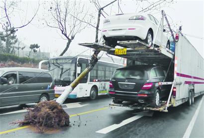 ????今晨6時(shí)30分許,一輛運(yùn)送小汽車的雙層大貨行至56中門口時(shí)準(zhǔn)備拐彎,突出的車尾直接將路旁一棵4米多高的樹刮倒并連根拔起。貨車拖著大樹駛出40多米后,在一輛轎車的提示下才停下車。