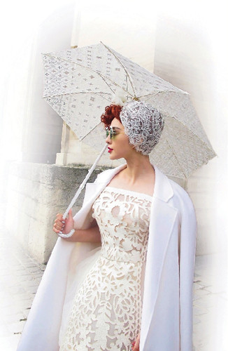縱觀整體造型,不難看出范爺要將古著風進行到底——她的白色蕾絲頭飾是私藏的單品,再加上白色大衣和蕾絲白色LV小陽傘,一出場自然十分搶鏡。