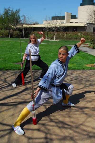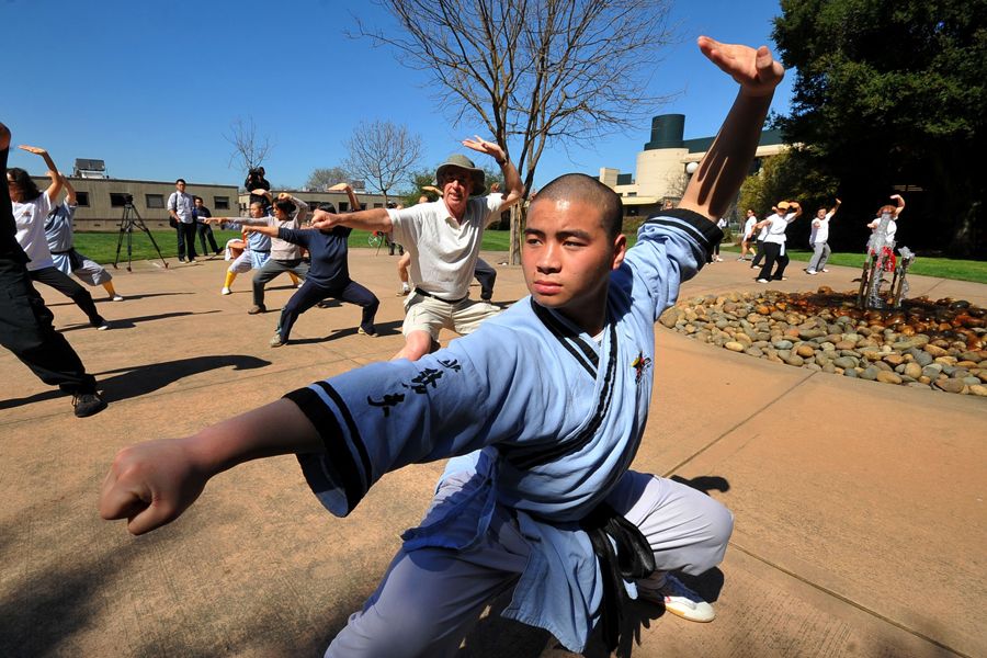 當?shù)貢r間3月9日,美國加利福尼亞州的斯坦福大學,少林功夫班的學員在教練(前)帶領下練習基本功。