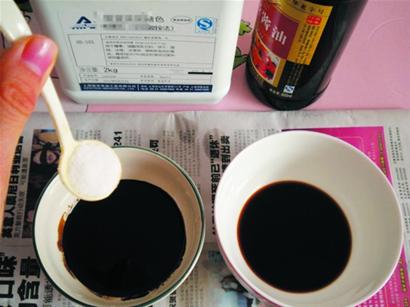 顏色過深的醬油要當(dāng)心 于廣深告訴記者,他在執(zhí)法檢查中發(fā)現(xiàn),有些違法作坊用焦糖色等添加劑,加上鹽和水,就勾兌配制出了所謂的醬油,造假成本很低。記者看到,正規(guī)醬油的配料一般包括水、脫脂大豆、麥麩、食鹽、黃豆、小麥粉、白砂糖、增味劑、苯甲酸鈉、焦糖色、安賽蜜等,是經(jīng)發(fā)酵釀造而成的。 “焦糖色是允許添加到醬油里的,但有嚴(yán)格的比例控制。 ”于廣深告訴記者,品質(zhì)好的醬油顏色會(huì)顯得比較深,但如果顏色太深,則表明其中添加了過量的焦糖色,氣味和滋味都會(huì)差一些。優(yōu)質(zhì)醬油鮮咸適口,醇厚協(xié)調(diào),稍有甜感,回味悠長(zhǎng);假冒、劣質(zhì)醬油味感咸苦,無鮮味,甚至有酸、澀等異味。 勾兌假醬油能以假亂真 3月9日,記者去撫順路批發(fā)市場(chǎng)花20元買了一桶焦糖色,回到“消費(fèi)實(shí)驗(yàn)室”里,記者準(zhǔn)備了兩個(gè)碗,往右邊碗中倒入合格醬油,左邊的碗將用于“造假實(shí)驗(yàn)”。記者先將焦糖色倒入碗中,看到上層漂浮的油花類物質(zhì)很快散去,湊近一聞?dòng)泄深愃萍t燒肉的味道。然后往里添加了一勺食鹽,再倒入飲水機(jī)里的純凈水。由于焦糖色的包裝說明上,使用方法僅寫著:“自低用量起逐步調(diào)至理想色度”。記者攪拌后發(fā)現(xiàn),假醬油明顯比真醬油的顏色深。一開始記者在調(diào)配過程中,很難掌握焦糖色和水的比例。隨后,記者在洗碗時(shí)豁然開朗,重新按焦糖色和水約1:10的比例,調(diào)制出了和真醬油顏色相差無幾的“孿生兄弟”。 相關(guān)新聞 質(zhì)監(jiān)教你“感官鑒別法” 于廣深介紹,市民如果覺得買回家中的醬油有質(zhì)量問題,可以通過“感官鑒別法”做個(gè)小實(shí)驗(yàn)。首先看色澤:取少量醬油放在白底瓷碗內(nèi),優(yōu)質(zhì)醬油呈紅褐色或淺紅褐色,不發(fā)烏,有光澤;一般劣質(zhì)醬油顏色發(fā)烏,無光澤;但有的醬油顏色并不是很深,所以不能單純以色論質(zhì)。其次嗅氣味:合格醬油應(yīng)無鹵氣,有宜人的豉香,較濃的醬香及酯香,醬香濃郁;假冒、劣質(zhì)醬油常有焦苦味、糖稀味,或香氣不純,或無香味。然后觀著色:取少量醬油放在白底瓷碗內(nèi),輕搖瓷碗,優(yōu)質(zhì)醬油含有較多脂類物質(zhì),體態(tài)粘稠,對(duì)碗壁附著力強(qiáng),留色時(shí)間長(zhǎng);偽劣醬油在碗壁上的附著時(shí)間短。最后看泡沫,優(yōu)質(zhì)醬油因含較多的有機(jī)物質(zhì),用筷子攪拌時(shí)起多量泡沫,不易消失;質(zhì)量差的醬油由于可溶性固形物、氨基酸和還原醣含量少,攪拌后泡沫少,容易消失。 |