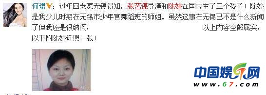 演員何珺在微博上爆料稱(chēng),過(guò)年回老家無(wú)錫得知,張藝謀導(dǎo)演和陳婷在國(guó)內(nèi)生了三個(gè)孩子。此外,她還稱(chēng)陳婷是其少兒時(shí)期在無(wú)錫巿少年宮舞蹈班的師姐,并在微博上附了陳婷的近照。此言論一出,立刻引起軒然大波,圈中人及網(wǎng)友均對(duì)此持以懷疑態(tài)度。針對(duì)此,今日何珺再次在微博上發(fā)言,稱(chēng)自己只是一個(gè)小演員,對(duì)方為大導(dǎo)演,發(fā)微博的目的只是希望能讓事實(shí)真相多留一會(huì)。