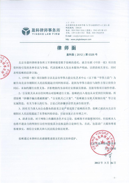 北京市盈科律師事務(wù)所王軍律師接受歌手張咪的委托,就音樂劇《中國一夜》項目投資糾紛引發(fā)的各種非議與爭端,代表張咪本人發(fā)出本媒體聲明函,以澄清相關(guān)事實,同時表明張咪的法律立場:
