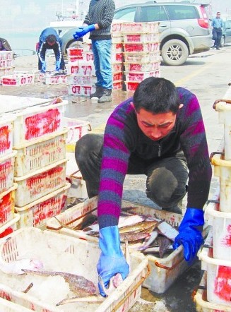 ????3月28日上午10時的沙子口漁港碼頭上,一艘漁船剛剛從海上歸來。剛剛停穩(wěn),早已等候多時的魚販兒們一下子圍了上來。沒經(jīng)過幾輪討價還價,接近一萬斤的海鮮很快就被搶購一空。