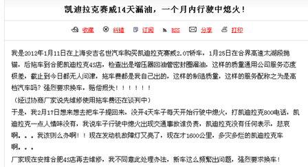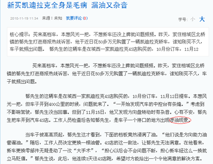 ![]() 汽車工業(yè)發(fā)展至今,已經有太多的不可替代性,龐大的產業(yè)鏈帶動了世界經濟的發(fā)展,也就在汽車銷量的不斷增加的同時,很多問題也層出不窮,品牌的召回消息時常被見到,各經銷商的售后服務也逐漸成為社會關注焦點,當熱情、專業(yè)、及時、周到的服務標準被列在一家家經銷商售后服務區(qū)時,我們仍然能看到許多觸目驚心的反面案例。 2011年初,我國汽車保有量已突破1億輛,汽車后銷售市場規(guī)模消費達到4000億元。隨著品牌和經銷商不斷增多,整車銷售利潤下降,行業(yè)利潤逐漸向后銷售市場轉移。售后服務盈利成為經銷商利潤增長點。在這個基礎上,經銷商的售后服務也就被推到風口浪尖,成為媒體、車主們關注和爭議的焦點,如有品牌召回還則罷了,如果是車輛自身問題,又沒有官方說法,車主們的利益和權力該如何被保護就成了關鍵問題。尤其是高端車,動輒幾十萬的價格并不是車主們輕描淡寫地就可以接受的。 案例:凱迪拉克漏油情況 2010年8月21日,湖南18位凱迪拉克車主到4S店檢測,除了一臺SLS和一臺只跑了1800公里的SRX沒有發(fā)現漏油,還有一臺CTS沒做檢查,其它15輛車(以SRX為主)都有漏油現象,差速器、變速箱,車身底部許多零部件都被油浸透。 原文:“2011年8月21日下午,湖南凱迪拉克車友會集結拉18臺車前往4S店進行漏油檢查,結果證明上海專家的話是正確的--漏油是正常的!不管你們信不信,反正我是信拉!不知道全球的SRX漏油拉沒有,反正我們湖南凱迪拉克車友會的SRX是漏拉。正如上海專家說的一樣--只不過漏油多少的問題……”