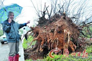 清遠(yuǎn)連州狂風(fēng)將一棵大樹連根拔起。(記者 曹菁 通訊員 陳儉靈 攝)