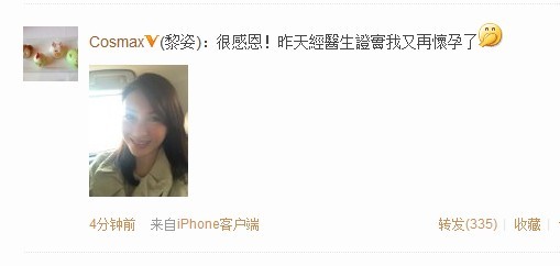 4月6日,香港女星黎姿在微博上宣布自己二度懷孕,她興奮地在微博上說:“很感恩!昨天經(jīng)醫(yī)生證實我又再懷孕了?!绷⒖桃齺砹藥装倜劢z的恭喜。