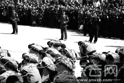 今年3月31日,與太康同屬周口的項城市召開嚴打整治推進會,51名嫌犯被五花大綁的圖片經網絡傳播后引發(fā)爭議。 資料圖片
