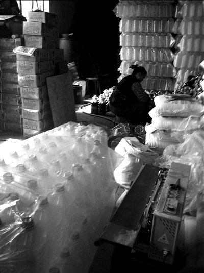 ![]() ??? 黑作坊隱蔽且警惕性高 ????3月27日,讀者劉明(化名)致電本報稱,他到通州潞城鎮(zhèn)七級村辦事時,意外發(fā)現(xiàn)一間民房里堆放著數(shù)十個編織袋,一些人將編織袋里的白色粉末分裝到小塑料袋內,小塑料袋上寫有“精制加碘鹽”。劉明仔細觀察后懷疑,編織袋內是工業(yè)鹽。與此同時,劉明還發(fā)現(xiàn),民房內好像還在分裝劣質醬油。 ????3月30日,記者來到七級村,找到了那間極為隱蔽的民房。民房內共有約8間屋子,分裝鹽的屋子朝北,面積約40平方米,院子里其他房屋是一家家具廠在使用。而分裝鹽的屋子里存放著一些做好的桌子,像是家具廠的倉庫。 ????記者以購買大量家具為由,找到家具廠老板,并提出要看看桌子的樣品。在家具廠老板帶領下,記者進入分裝鹽的屋子,里面堆放著近60個編織袋,袋子上寫著“白鵝牌高級精制鹽”,重量為50千克,產品標準一欄標注為GB/T5462-2003,生產廠家為湖北七二八鹽業(yè)公司。屋里還堆放著上百個空塑料桶,和一些標注著醬油的已經裝滿的塑料桶。屋內的幾個人正在碼放編織袋,或整理空塑料桶。當記者和家具廠老板離開后,屋里的人立刻將屋門插好,表現(xiàn)出高度的警惕性。 ????