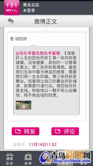 ????本應(yīng)用主要包含麥凱樂青島總店與黃島店的實(shí)時活動信息、品牌介紹與推薦、麥凱樂官方微博等內(nèi)容;其中內(nèi)置樓層平面圖與地圖導(dǎo)航,幫助您更便捷的進(jìn)行購物;精心設(shè)計(jì)的操作界面,精挑細(xì)選的活動信息推送,讓您快樂暢享移動互聯(lián)網(wǎng)時代的便捷生活。