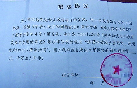 通過網(wǎng)絡(luò),仇勇給記者傳了一張翻拍的“捐資協(xié)議”照片。記者看到,該協(xié)議上寫著“我單位自愿向大足區(qū)實(shí)驗(yàn)幼兒園捐資元”字樣,而在協(xié)議末尾“捐資單位”一欄,仇勇已經(jīng)找單位蓋了一個公章。